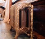 Справа от входа расположена гостевая спальня. Поскольку основная жизнь происходит в столовой и барной зоне, то надо было постараться максимально отдалить спальню от них, что позволяет гостям, решившим пораньше лечь спать, не слышать шума от продолжающегося застолья. Изначально здесь предполагался санузел и были выведены все необходимые трубы. Проблему была решена с помощью стены из гипсокартона, для доступа к коммуникациям сделаны люки-невидимки, которые в свою очередь замаскированы полиуретановой лепниной. Этот же трюк был проделан и с трубами на противоположной стене: зашили в короб и замаскировали лепниной, которую выкрасили в золотой цвет. Фактурная штукатурка под мрамор и новый пол из массива американского ореха дополнили интерьер спальни и сделали ее уютной и комфортной для гостей.