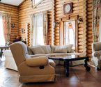 Входная зона примечательна массивной кованой дверью, выполненной по авторским чертежам. Чтобы максимально облегчить маленькое пространство, дверцы шкафа выполнили из того же оцилиндрованного бревна, из которого выстроен весь дом. Для придания большей легкости пространству, которое несколько отягощается обилием дерева, в холле использовали минимальное количество мебели, а основной акцент сделали на лестницу и кожаный винтажный комод. Данный прием позволяет, как бы поэтапно переместиться с улицы, где много воздуха, в замкнутое помещение и сохраняет чувство единения с природой.