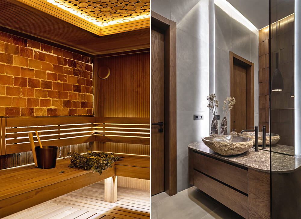 Для отделки помещений использованы панели из шпона, переходящие в скрытые высокие двери, керамогранит и декоративная фактурная штукатурка, которая cоздает красивые цветовые переходы и интересно смотрится при игре света.