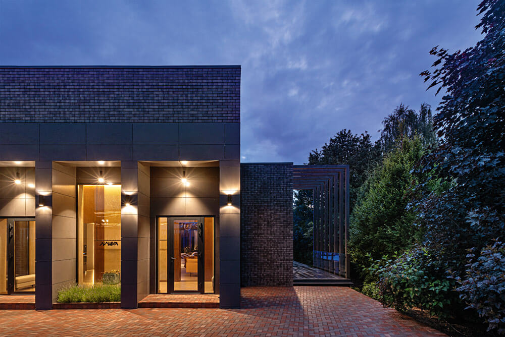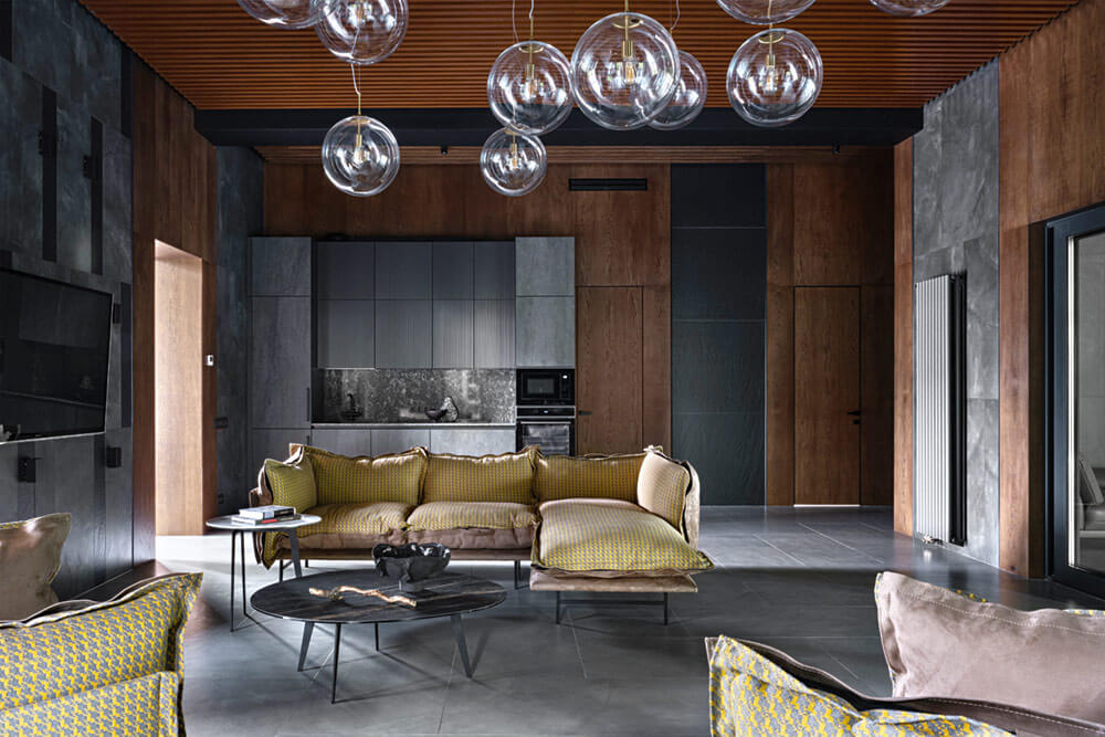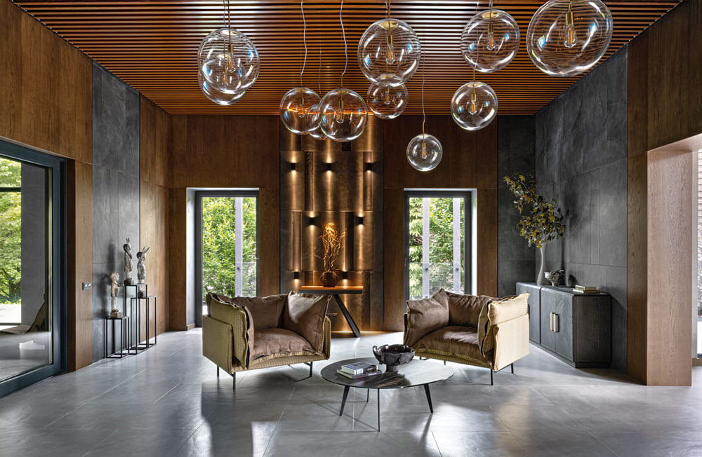 Так как в доме установлена система «теплый пол», в качестве напольного покрытия выбрали керамогранит от Griffon Style®. Для кухонных фасадов использовали каменный шпон с выраженной фактурой, идеально сочетающейся с полом. Чтобы придать пространству ощущение глубины, потолок сделали реечным и практически везде предусмотрели различные сценарии освещения, создающие интересный динамичный эффект. В этом дизайнерам помогла компания Bright Buro®. Вся мебель для проекта изготовлена на заказ.
