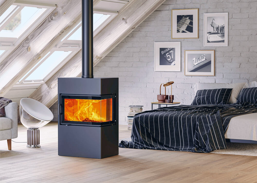 Каминная печь Austroflamm Dexter 2.0®, установленная в центре спальни