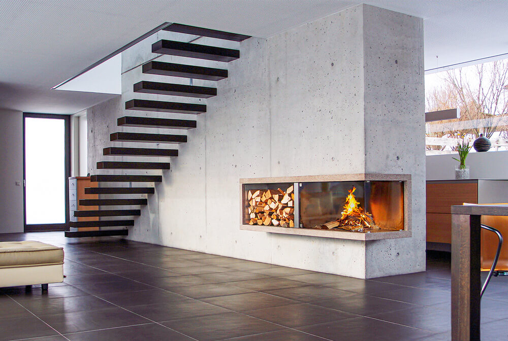 В этом интерьере Mandl& Bauer® угловой камин согревает открытое пространство первого этажа