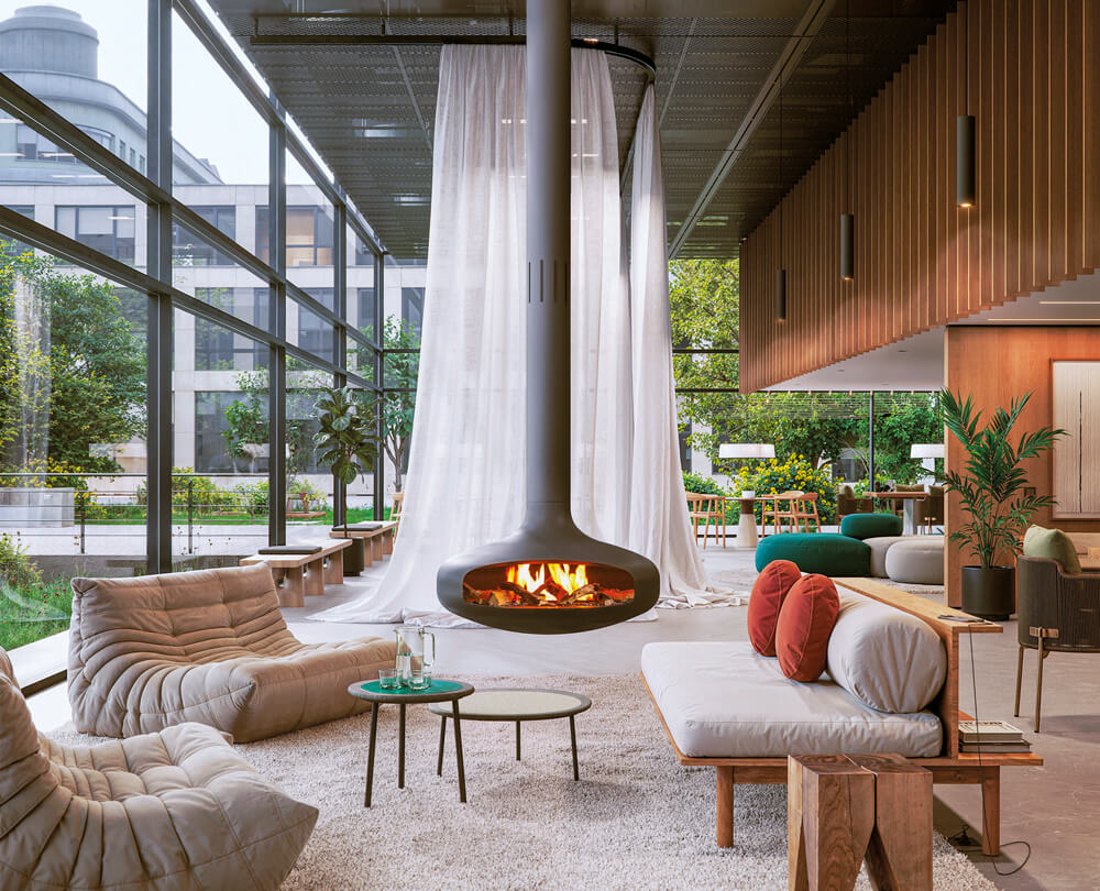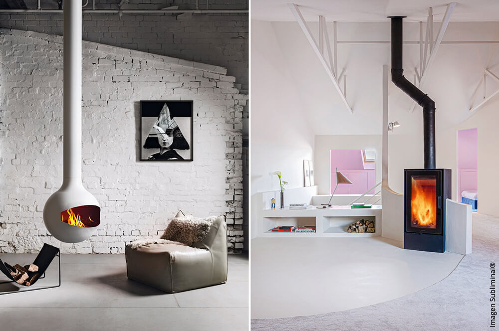 Слева: подвесной камин Bathyscafocus® (Focus®, Франция). Справа: интерьер с каминной печью, проектирование Casa Antillon® (Imagen Subliminal®)