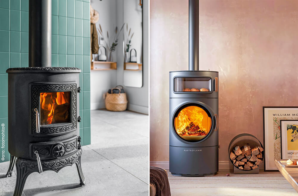 Слева: каминная печь в подчеркнуто винтажном стиле в интерьере загородного дома, разработанного бюро Raca Architekci®. Справа: модель Austroflamm®, каминная печь Clou Xtra® с круглым стеклом дверцы в модификации с небольшой духовкой, дизайн — Cesare Monti Studio®