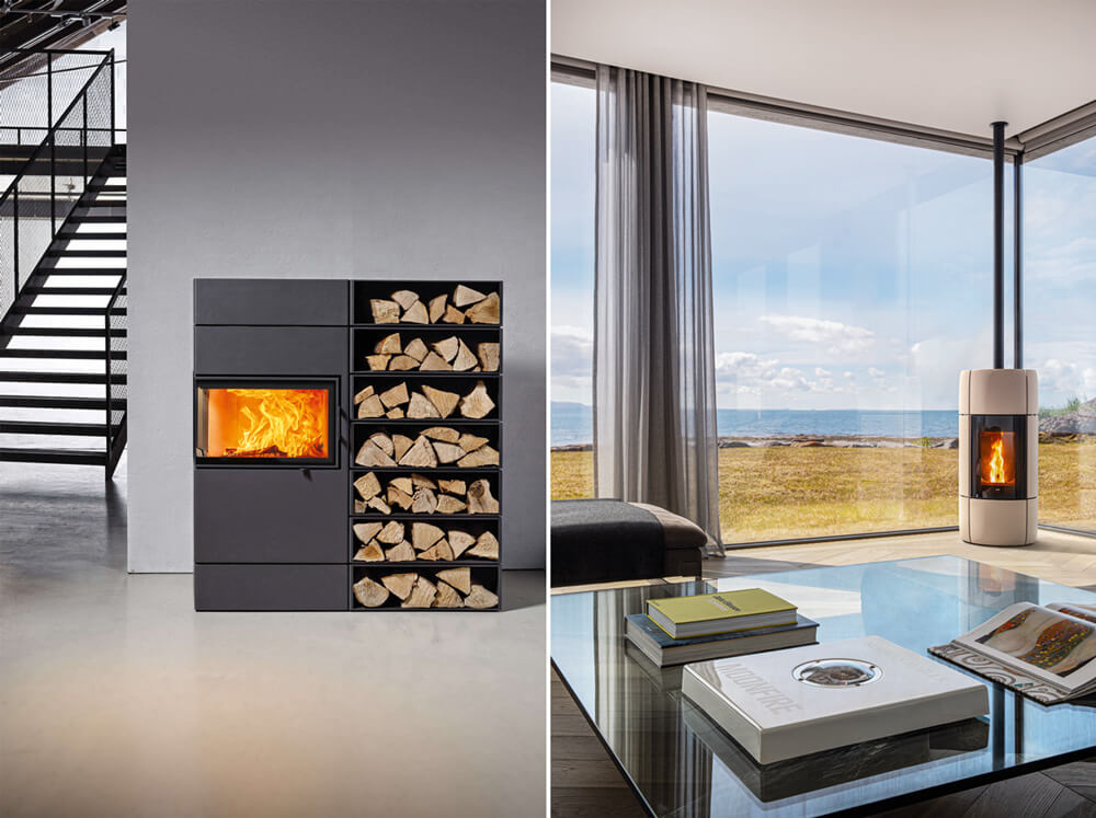Слева: каминная печь Dexter 2.0®. Справа: Пеллетная каминная печь MCZ Curve® (Италия) в керамической облицовке