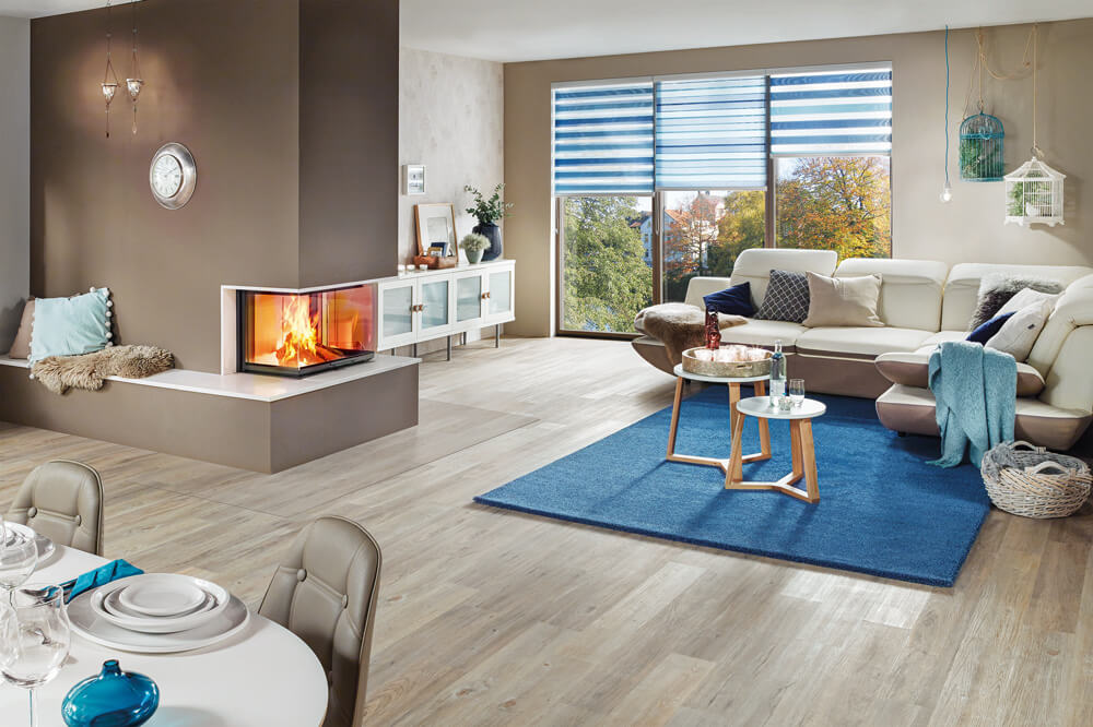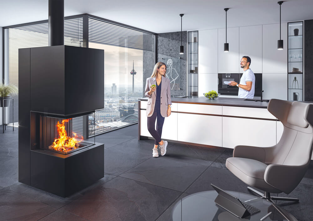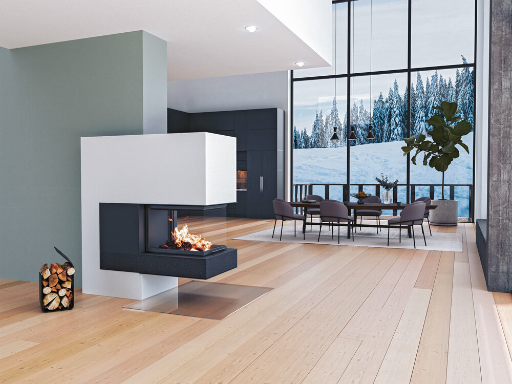 Полуостровной камин Brunner Panorama 51/66/50/66® (Германия) визуально отделяет зону столовой от гостиной